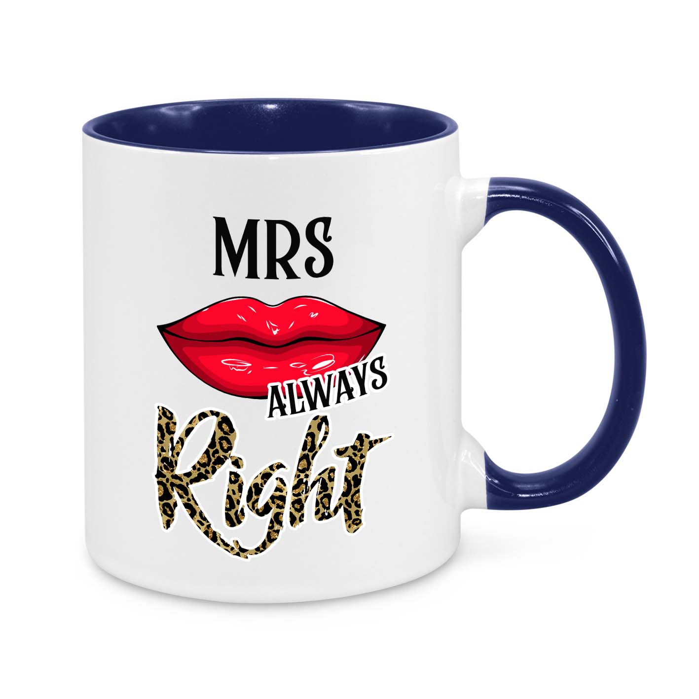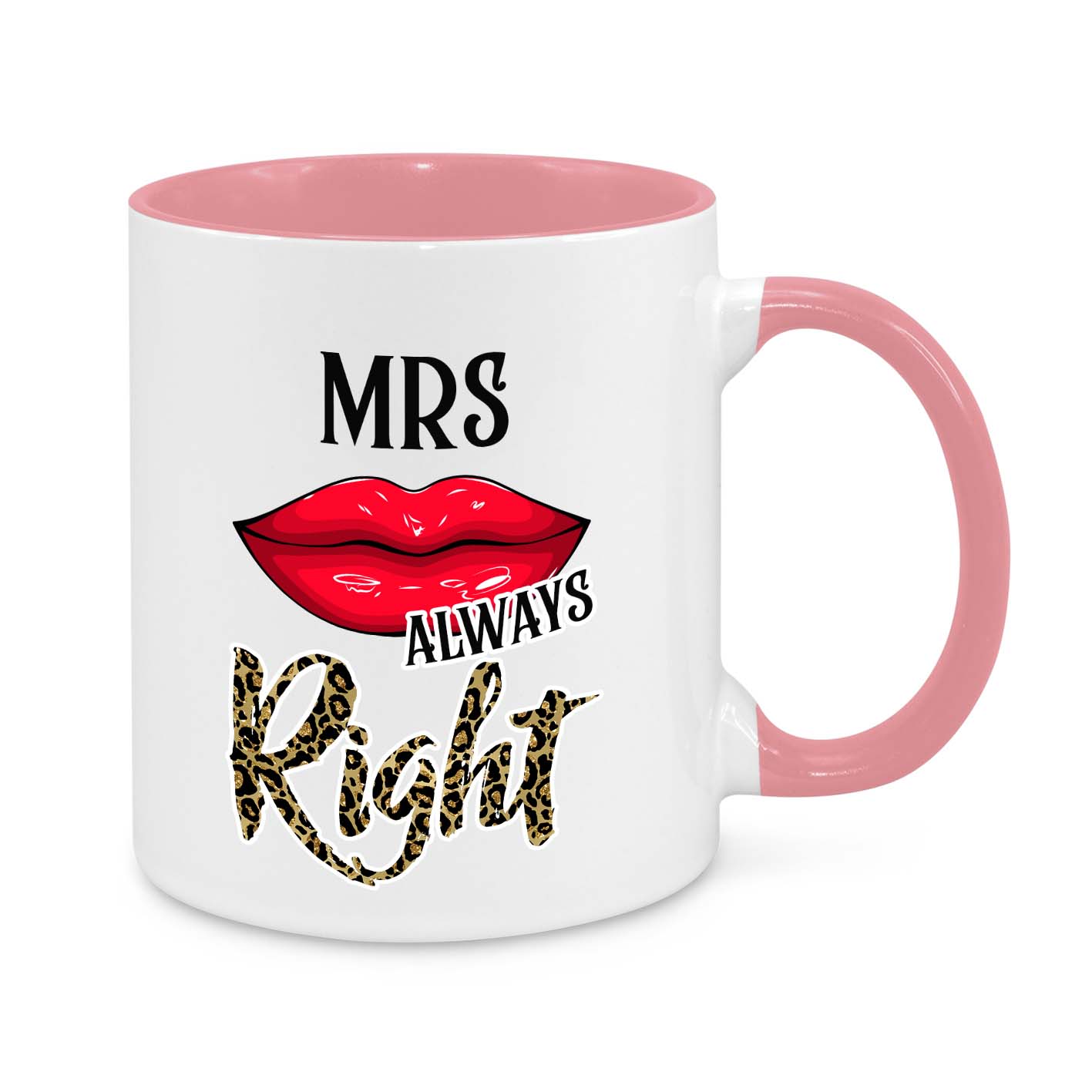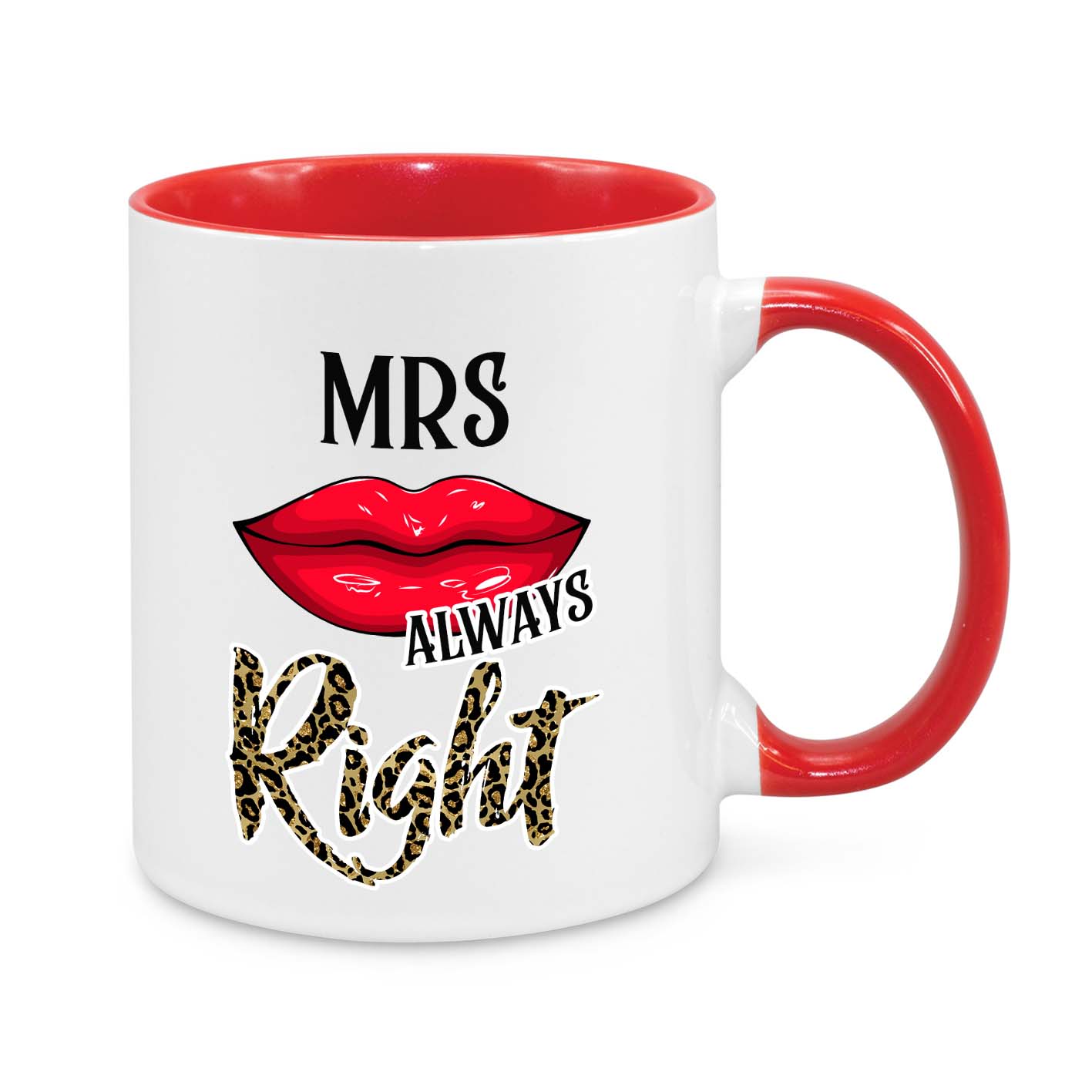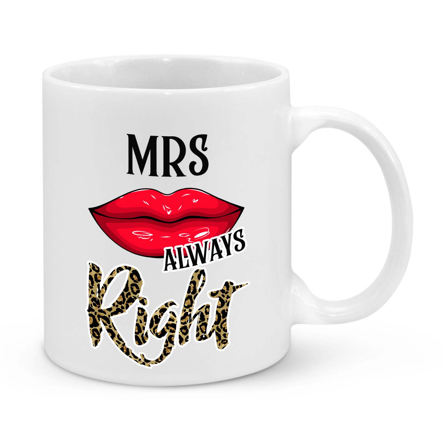 This hilarious and stylish "Mrs. Always Right" mug is the perfect gift for wives who know best! Featuring a sassy red lipstick kiss, bold typography, and leopard print lettering, this mug is a must-have for every confident and fabulous woman!