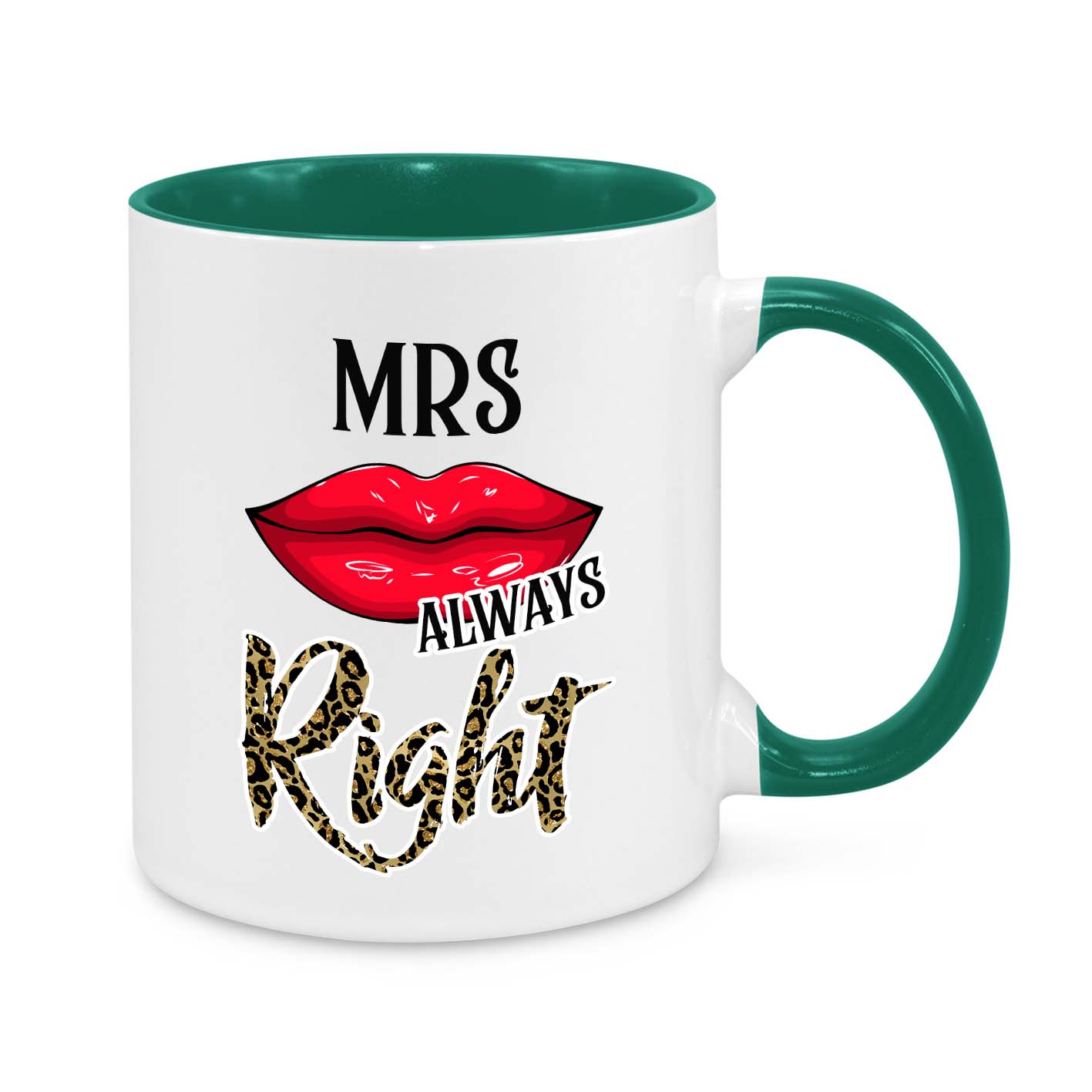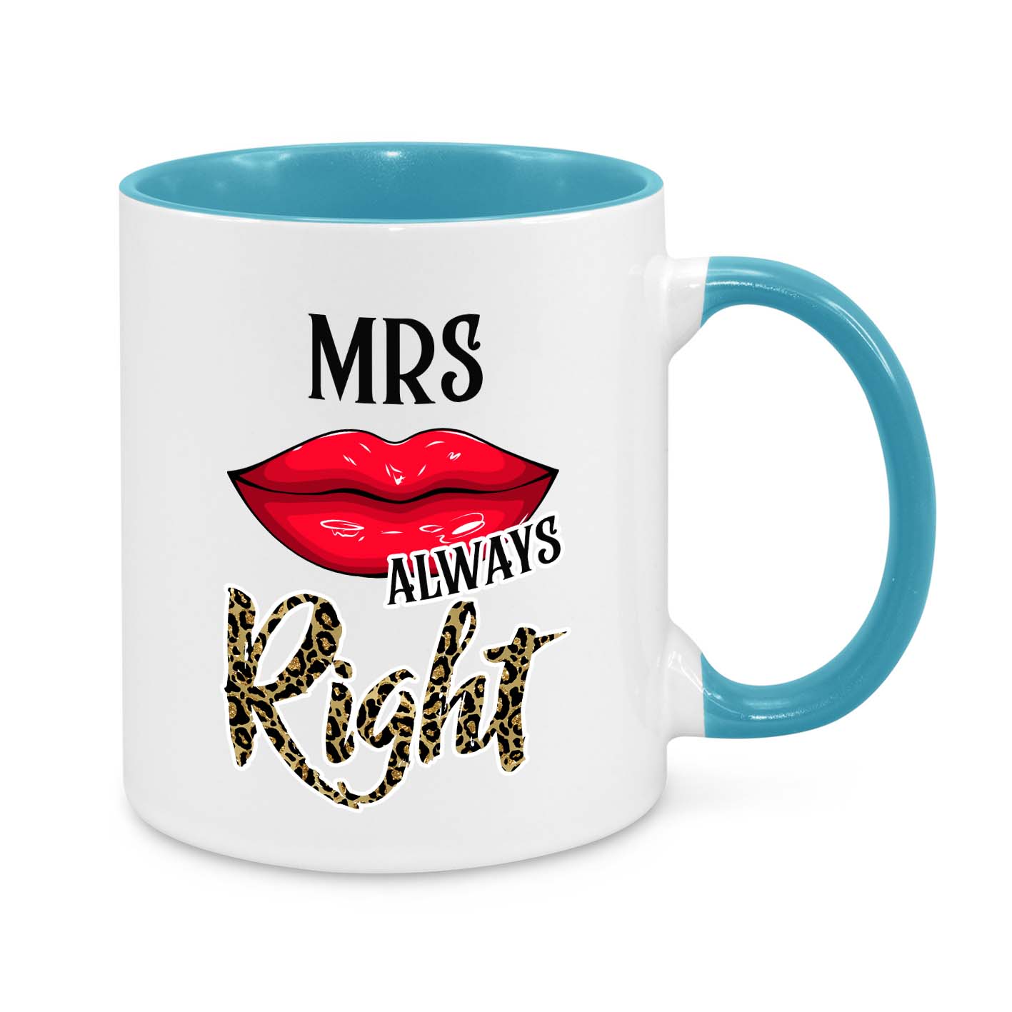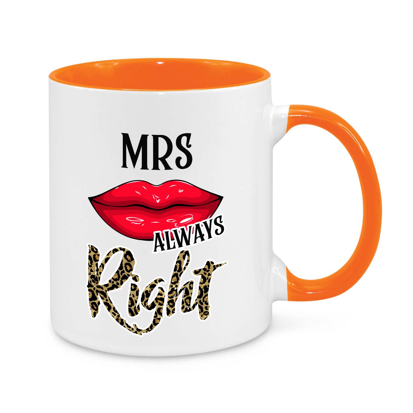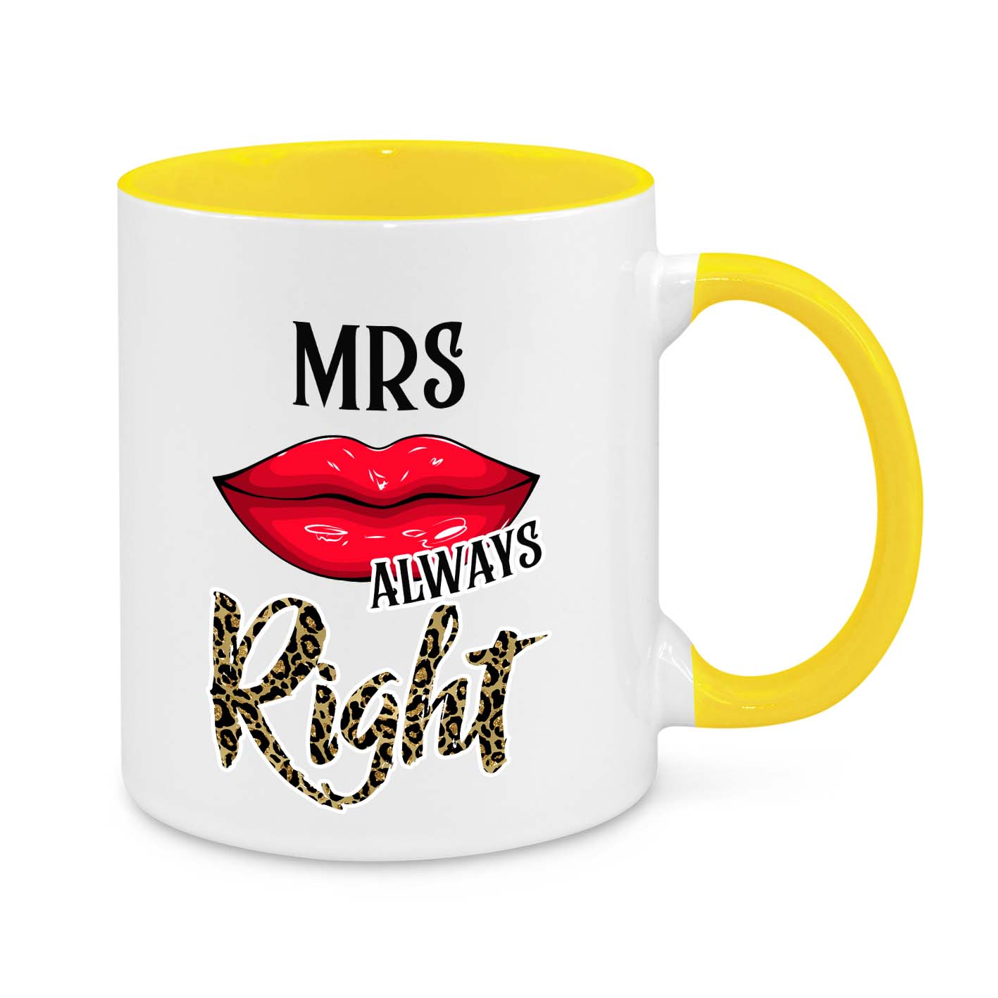 This hilarious and stylish "Mrs. Always Right" mug is the perfect gift for wives who know best! Featuring a sassy red lipstick kiss, bold typography, and leopard print lettering, this mug is a must-have for every confident and fabulous woman!